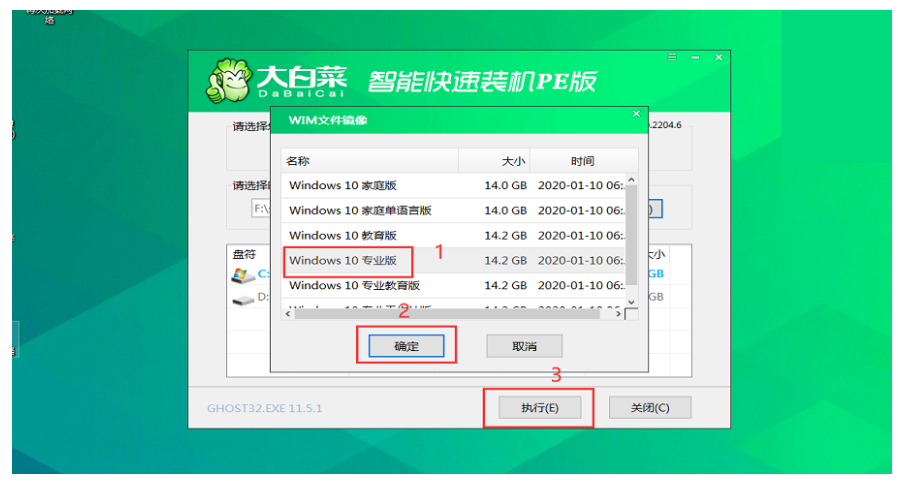 4、然后選擇U盤中提前下載好的ISO鏡像文件進行安裝,參考下圖:選擇“windows10專業版”點擊“確定”,再點擊“執行”在大白菜一鍵還原窗口。