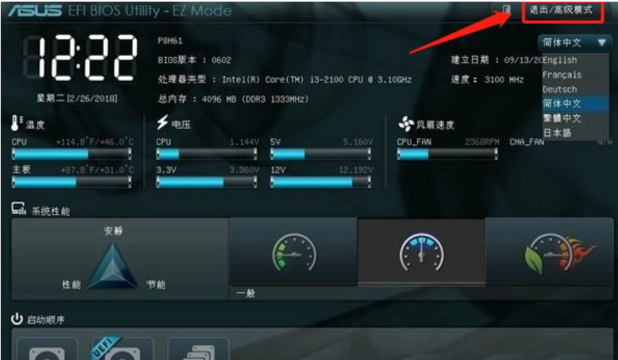 1、進入BIOS設置界面后,點擊右上角的高級模式/退出。