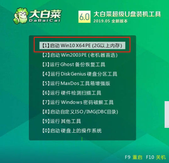 步驟四:當電腦屏幕出現大白菜主菜單的時候,我們應該選擇win10X64PE(2G以上內存),然后按回車鍵進入winpe的桌面。
