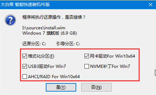 步驟六:當彈出還原窗口后,我們勾選“網卡驅動”以及“USB驅動”復選框,點擊“是”。當電腦重新啟動時,就將U盤取出,避免再次進入白菜桌面。