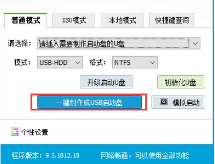 2、選擇普通模式,“請選擇”中選擇自身U盤設備名稱(一般會自動識別)。模式選擇USB—HDD,格式選擇“NTFS”。