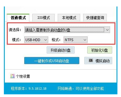 3、選擇普通模式選項卡,“請選擇”中選擇插入的U盤設備名稱(一般會自動識別)。模式選擇USB—HDD,格式選擇“NTFS”