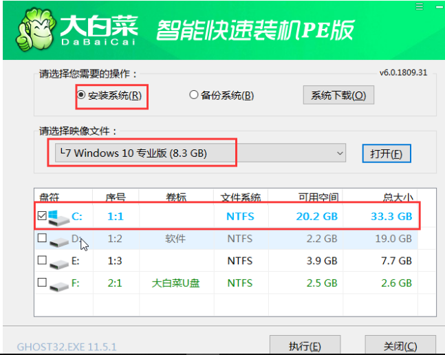 步驟三:然后打開大白菜軟件,在“映像路徑”中選中鏡像文件并選擇win10系統安裝位置,點擊“執行”即可。