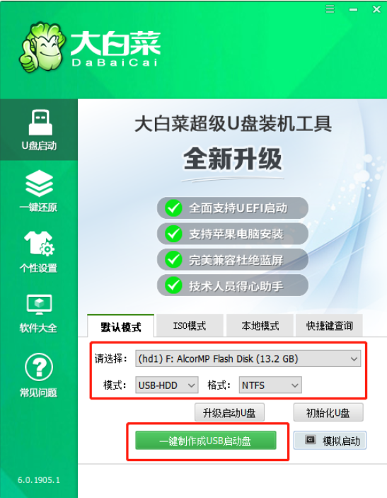 1、下載大白菜U盤啟動盤制作工具,插入U盤,打開并點擊一鍵制作,制作過程中會格式化U盤,注意備份資料。