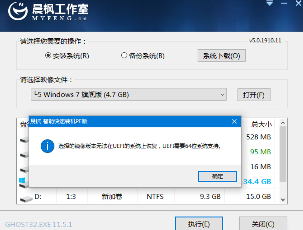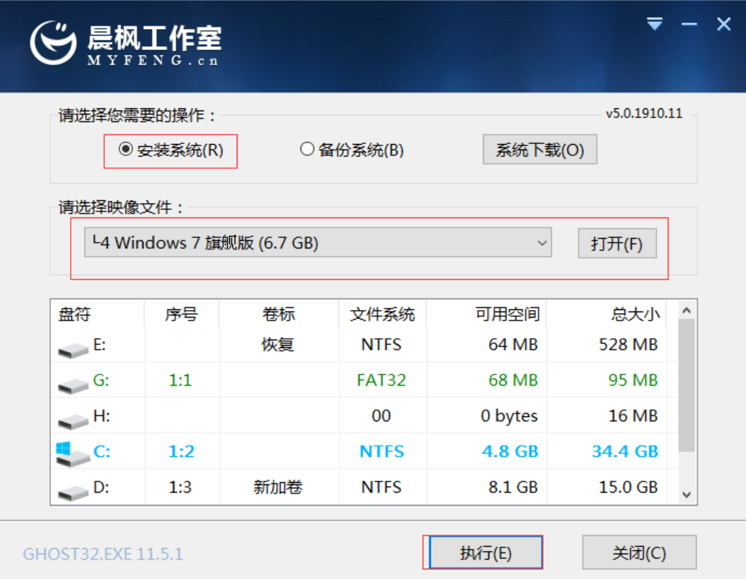 4、 打開晨楓軟件,勾選【安裝系統】,點擊【打開】找到之前下載好的win7鏡像系統,然后點擊【執行】。