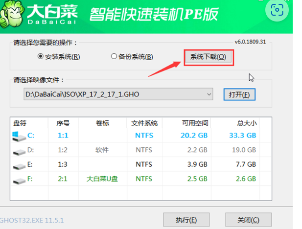 4、打開大白菜一鍵重裝后,我們可以選擇在線系統下載。