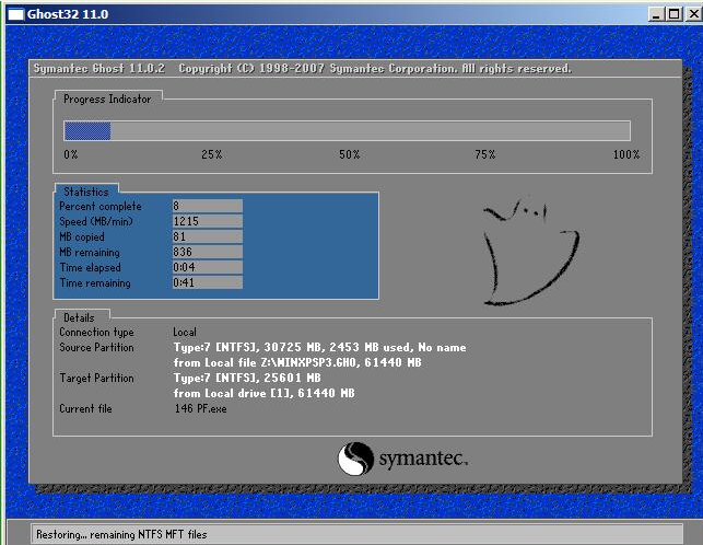 4、開始進行還原操作 ,此過程大約需要2-3分鐘的時間,完成后電腦將會重啟。