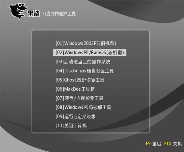 步驟七:然后就來到黑鯊PE啟動菜單選擇頁面,通常選擇【2】WindowsPE/RamPS(新機型),按回車就進入黑鯊PE了。