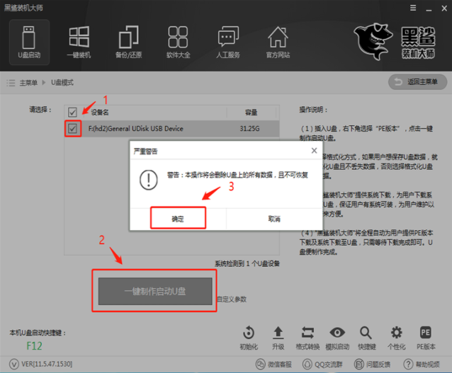 步驟二:我們按圖標順序操作,勾選你的U盤點擊一鍵制作啟動U盤,這時電腦會彈出格式化U盤的警告,我們單擊“確定”。