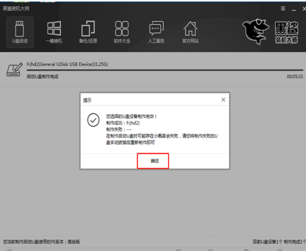 步驟五:U盤制作完成以后,電腦會彈出“制作成功的提示框,單擊確定。