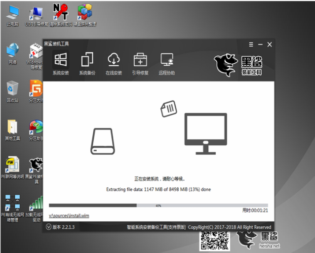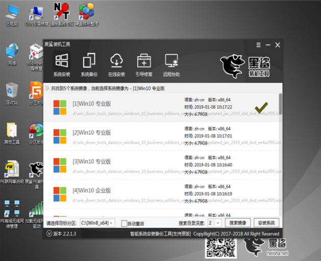 步驟八:電腦進入到PE系統桌面后,電腦會自動彈出黑鯊PE裝機工具,我們勾選需要安裝的Win10系統,目標分區選擇你的系統盤(通常為C盤),單擊“安裝系統”。