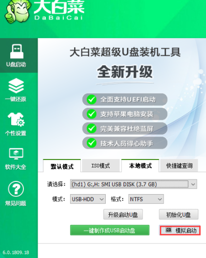 5、完成后,點擊模擬啟動,如圖所示的界面意味著U盤啟動盤的制作已成功完成。