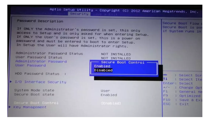 2、進入后用方向鍵與回車鍵操作,在Boot菜單下或者其他菜單如Security,把Secure Boot改為Disabled。
