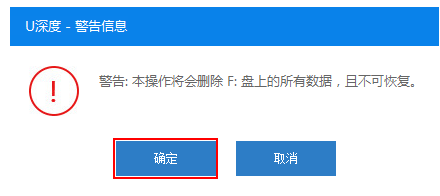 3、此時會彈出一個警告:“本操作將會刪除所有數據,且不可恢復”,若u盤中存有重要資料,可將資料備份至本地磁盤中,確認備份完成后點擊“確定”執行制作。