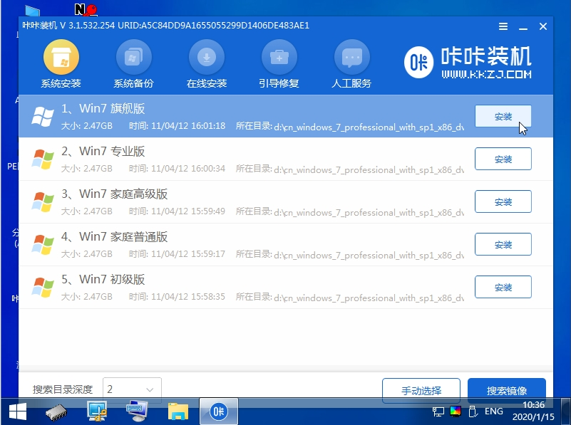 5、在pe系統桌面打開咔咔裝機工具,選擇需要的win7系統點擊安裝到系統盤c盤,安裝完成后重啟電腦。