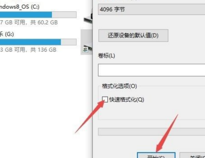 5、將迅速格式化的啟用給點擊取消掉,以后點擊開始。