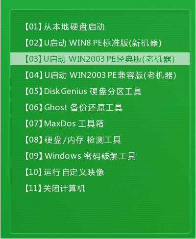 6、拔出啟動盤并將其插入需要重新安裝的計算機,然后重啟電腦,重啟電腦,電腦開機的時候按下U盤啟動快捷鍵選擇U盤并確認輸入,選擇【03】U啟動WIN2003 PE經典版(老機器)選項。