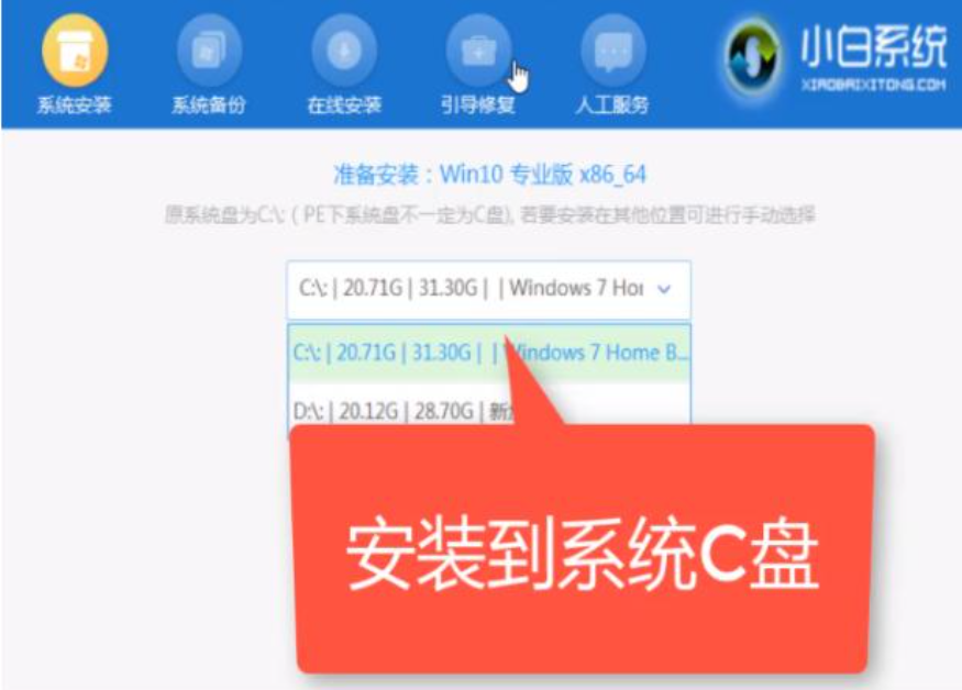 8、選擇C盤,點擊開始安裝。等待win10系統安裝完成后,拔出U盤,重啟電腦我們的win10系統就安裝好啦。