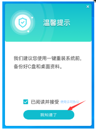 1、下載并運行石大師一鍵重裝,點擊“我知道了”。