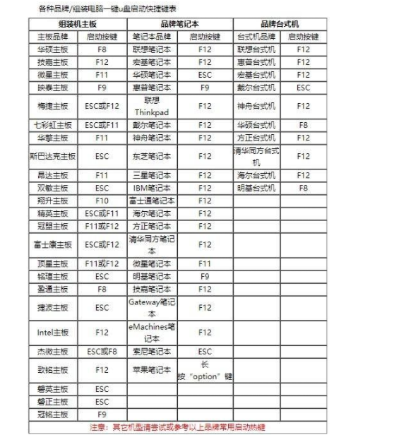 4、各種品牌/組裝電腦一鍵u盤啟動快捷鍵表: