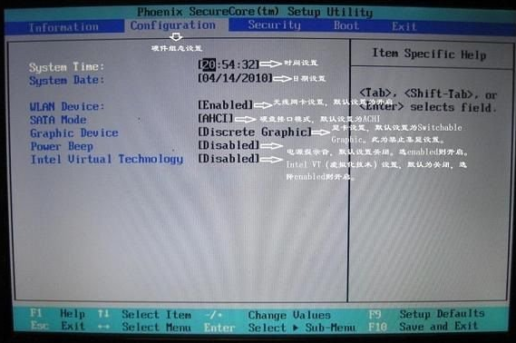 2、硬件組態設置。包括:時間、日期設置,無線網卡、硬盤接口模式、顯卡、電耗提示音、因特爾虛擬化技術等設置。如下圖所示:
