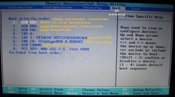 (2).如果您的啟動U盤是通過量產制作的,量產之后您的啟動U盤就被當作光驅來識別了。所以需要用按照上面的方法,把“USB CD/DVD ROM:”移動到第一個。
