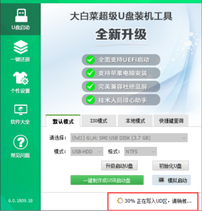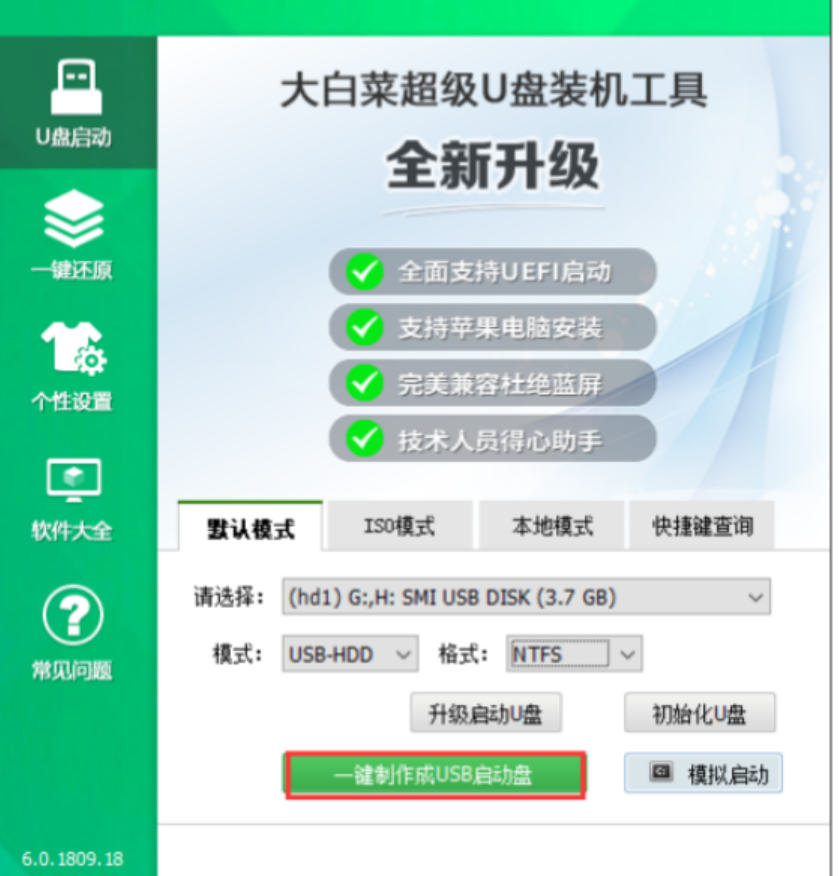1.下載安裝大白菜超級U盤裝機工具,u盤插入電腦,在主界面的“U盤啟動”模塊選擇【默認模式】。