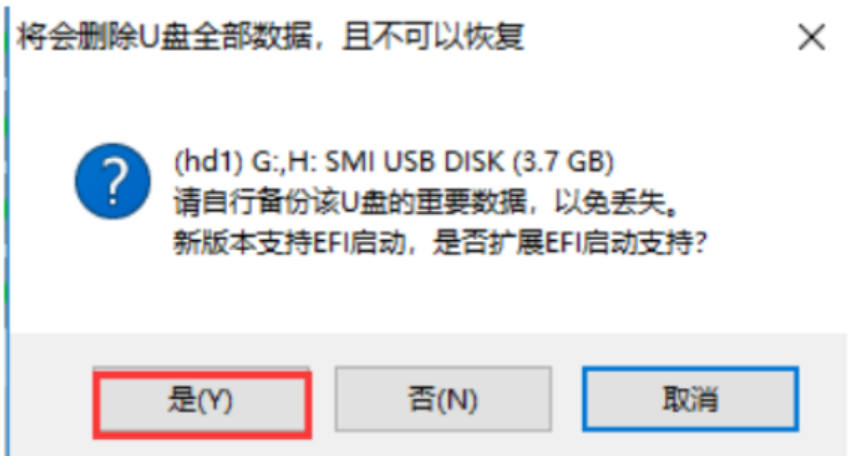 3.彈出將會刪除U盤全部數據,且不可恢復提示時,選擇【是】。
