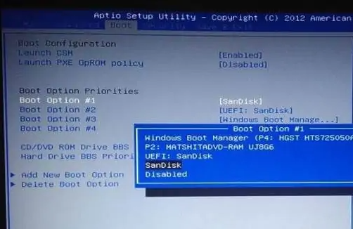 3、再切換至【Boot】,選擇【Launch CSM】--【Enabled】,繼續回車,開啟兼容模式。留在這個界面,選擇【Boot Option #1】,按回車,選擇U盤項回車即可。