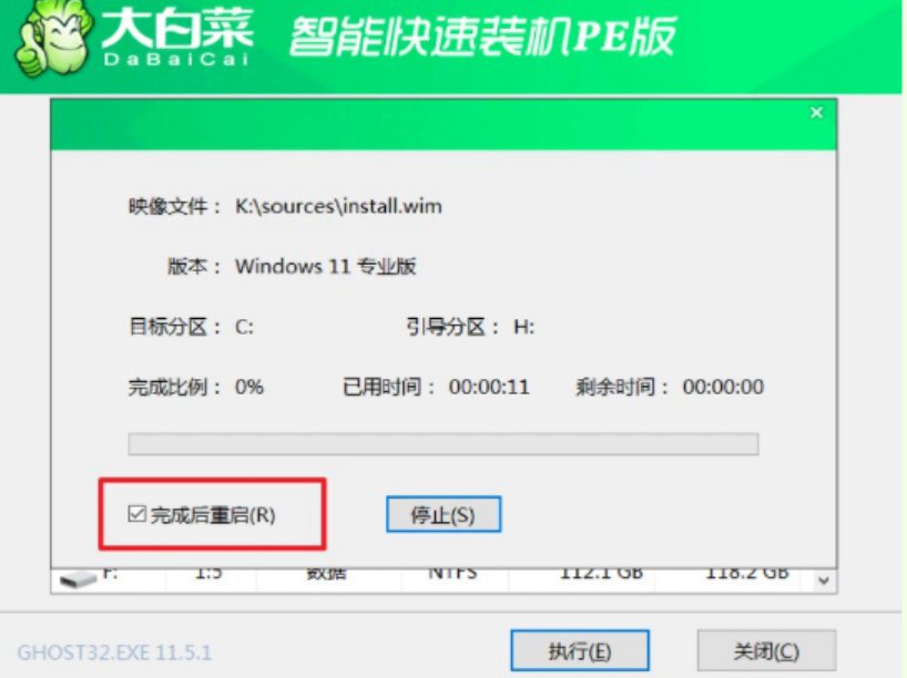 5、進入大白菜pe界面后,勾選第二項,然后點擊執行。