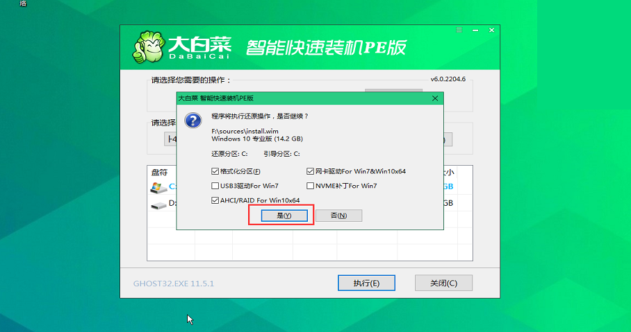 5、按提示操作,選擇“是”(建議“網卡驅動”和“USB驅動”這兩個選項都選,以免重啟后無法使用網絡和鼠標)