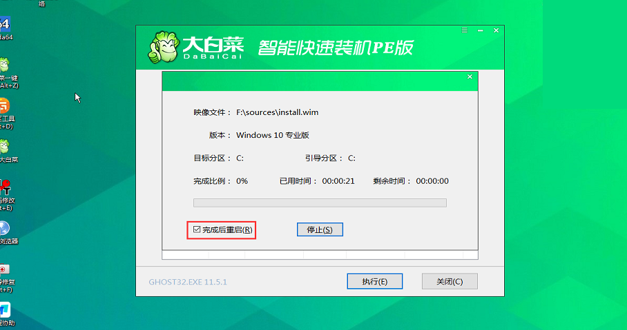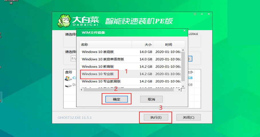 4、因為我們要安裝的是win10,所以這里選擇選擇“windows10專業版”點擊“確定”。這一步是通過U盤里面準備的ISO鏡像文件安裝,參考下圖,再點擊“執行”在大白菜一鍵還原窗口。