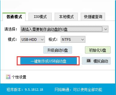 3、選擇普通模式選項卡,在請選擇中選項欄中選擇自身U盤設備名稱(一般會自動識別)。模式選擇USB—HDD,格式選擇“NTFS”。