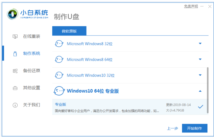 1、 插入U盤,然后打開小白U盤啟動盤制作工具,選擇“制作系統“,在制作系統中選擇制作 U 盤,在選擇 U 盤中選擇您的 U 盤,其它參數默認開始制作。