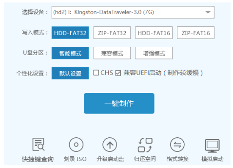 步驟3:插入U盤后設備選擇框則讀取到你的U盤設備,顯示了品牌名稱以及容量大小等,接下來寫入模式/U盤分區/個性化設置默認即可。