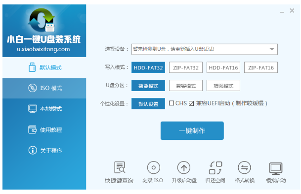 步驟2:安裝完成,打開小白一鍵U盤裝系統主界面,在左側默認模式/ISO模式/本地模式,一般以默認模式進行安裝,下圖是沒有插入U盤的提示效果。