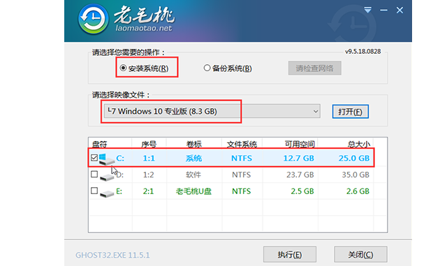 4、然后,打開老毛桃一鍵裝機軟件,選擇競相系統,點擊執行。