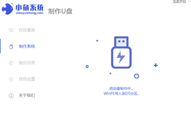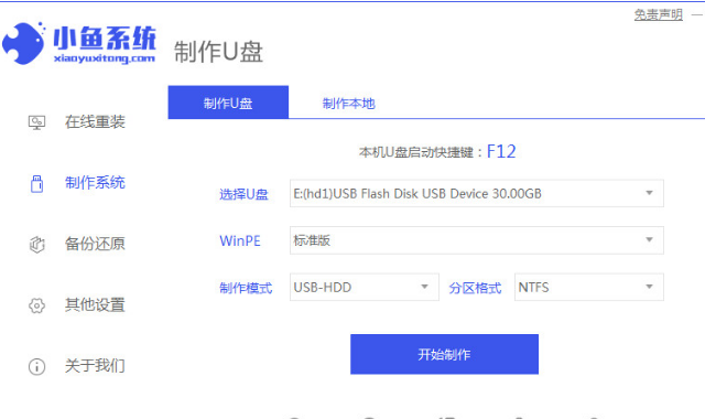 1、打開電腦以后,我們在桌面上找到一個名叫小魚重裝系統的工具,將它開啟進入到首頁以后,把自己的空白u盤插入到計算機之中,單擊第一頁中出現的開始制作按鍵。
