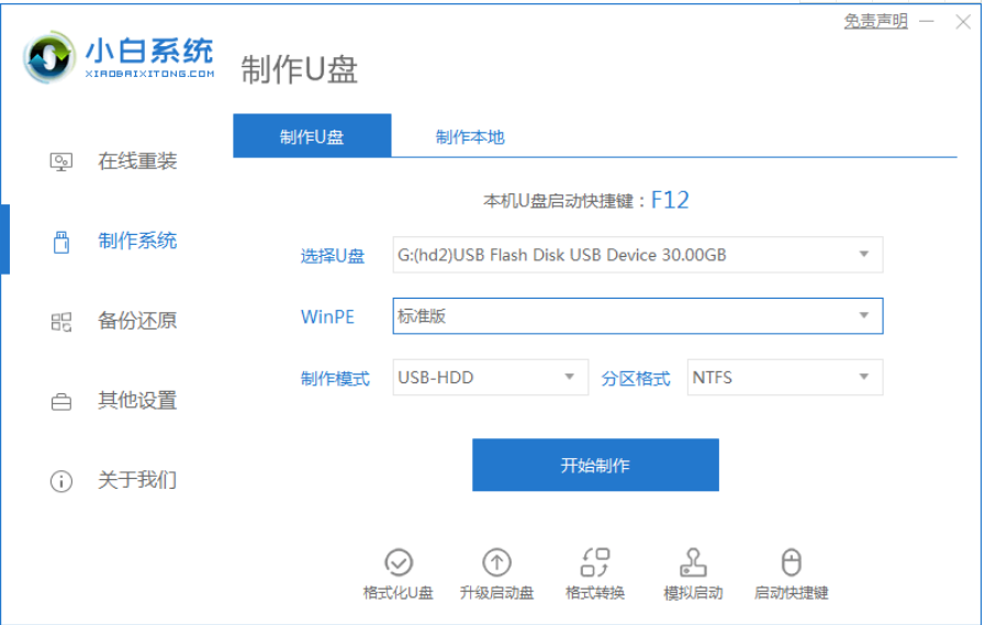1、下載安裝小白一鍵重裝系統,點擊開始制作。