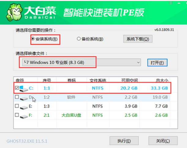 4、點擊打開桌面裝機工具,選擇“安裝系統”,“映像文件”選擇已下載的win7鏡像系統,安裝在“C盤”,鼠標點擊“執行”進入下一步。