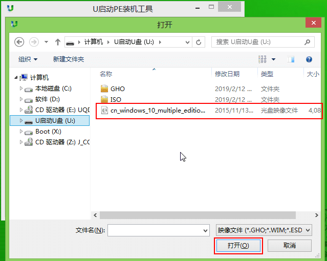 3、選中win10 iso系統鏡像文件,點擊“打開”按鈕: