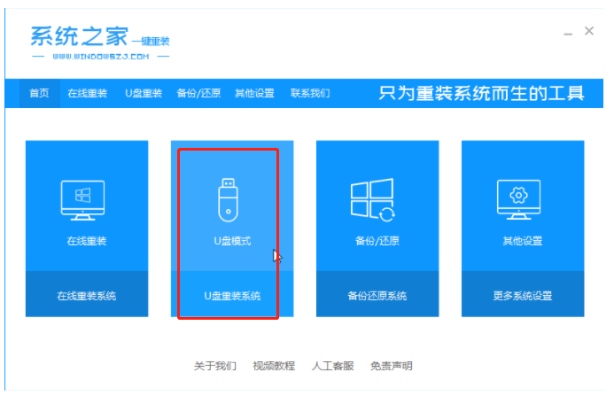 1、首先退出殺毒軟件,再打開"系統之家重裝”,選擇[【U盤模式】。參考下圖: