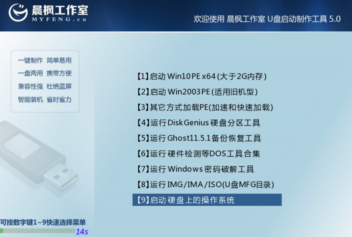 2、 進入晨楓pe主菜單界面后,選擇第一項【啟動Win10PE X64 (大于2G內存)】。