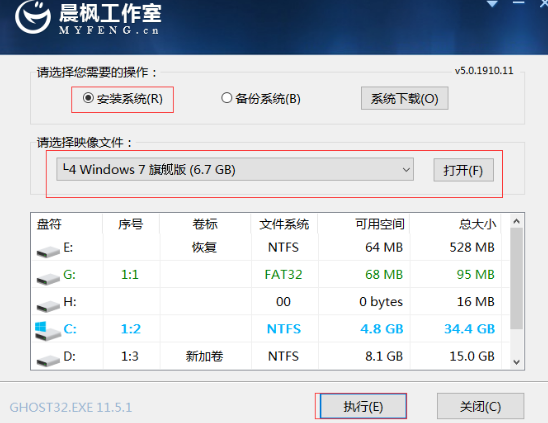 3、 進入pe系統后,打開晨楓軟件,選中【安裝系統】,然后點擊【打開】,選擇提前下載好的win7鏡像系統,并選擇將其安裝到c盤上,然后點擊【執行】。