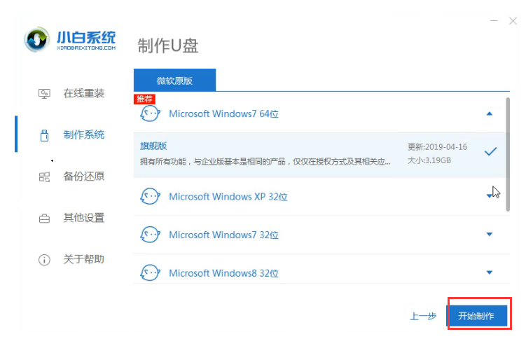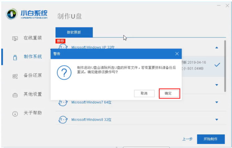 四、接下來選擇制作系統,點擊制作U盤,軟件會自動識別U盤,直接默認的不用修改,只需選擇要安裝的系統就可以了。(有提示出現就選擇【確定】)。