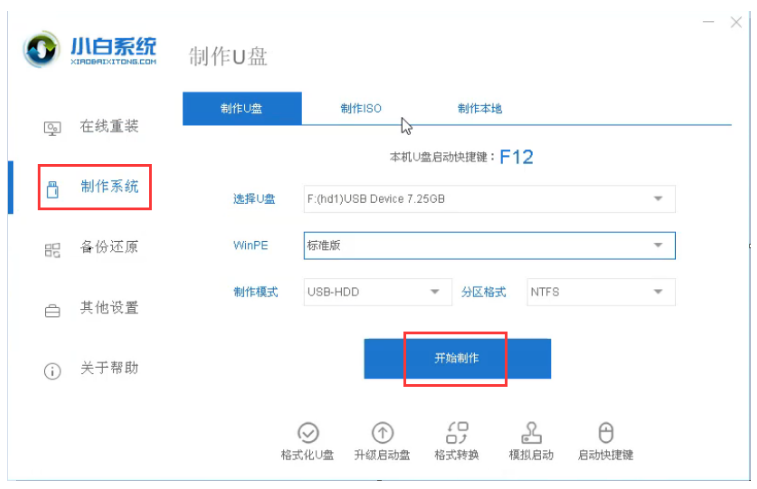 1、下載并運行小白一鍵重裝系統”工具,插入8G以上空白u盤,選擇u盤模式開始制作。