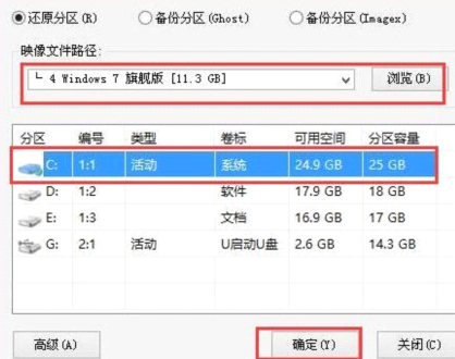1.進入pe工具之后,系統會自動跳出pe裝機工具,并且識別u盤中的系統鏡像文件。這里我們推薦選擇C盤(系統盤),選擇完成之后點擊【確定】