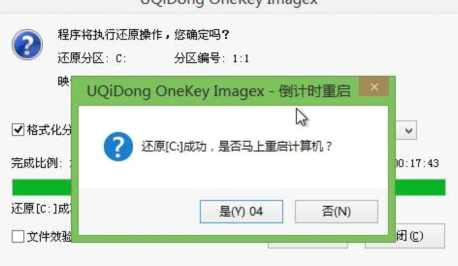 3、還原的過程需要一些時間,我們不要拔插U盤,耐心等待。還原結束后系統會彈出“是否馬上重啟計算機”,點擊【是】