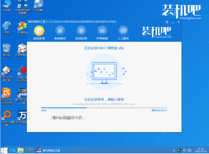 5、在pe系統中,點擊打開裝機吧裝機工具,選擇win7系統,點擊安裝到系統盤c盤,點擊開始安裝即可。