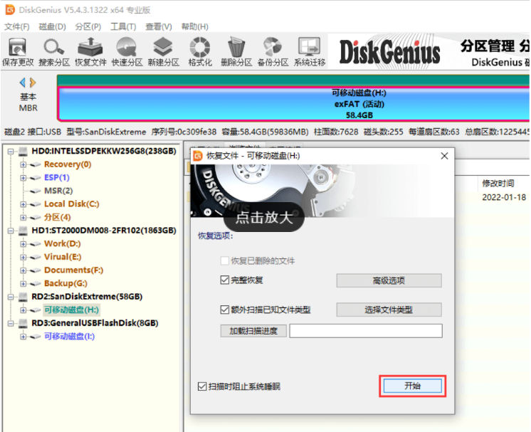 2、點擊“開始”,讓軟件開始對U盤進行全盤掃描即可。